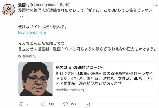 推文里写道:“漫画村的管理者被逮捕了,但是别着急发私信幸灾乐祸,方便的网页还在出现哦。”