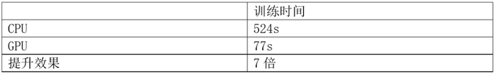 GPU提升效果为8倍,因为训练过程有验证测试,所以并未达到理论上的12.5x的加速。