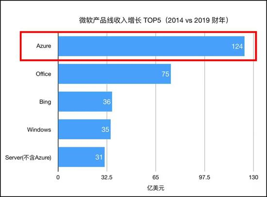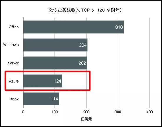 如果看2019财年,Azure124亿美元左右的年收入,已经可以排在Office、Windows和Server 产品之后,排在第4位。