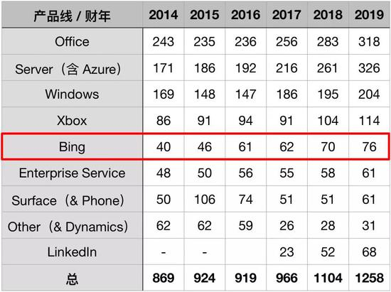从 2014财年到2019财年,Bing的收入变化:
