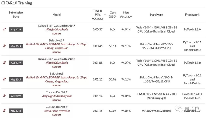 DAWNBench是斯坦福大学提出的基准,在这一排行榜中,准确度只要达到94%即可。