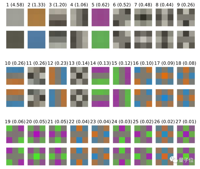 首先,绘制输入数据的3×3块的协方差矩阵的前导特征向量。括号中的数字是相应特征值的平方根,以显示沿这些方向的相对变化尺度,并绘制具有两个符号的特征向量以说明变化的方向。