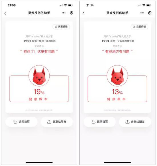 文字信息对机器来说还相对容易,图片和视频在技术上会有更大难度。目前,“灵犬”小程序还不支持检测视频。