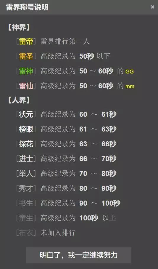 一人一号实名制,每个人都有属于自己的等级称号,网站将注册的会员统称为“雷界众生”。完成一局高级扫雷用时60s以上的是“人界”,60s以内是“神界”,50s以内是“雷圣”。
