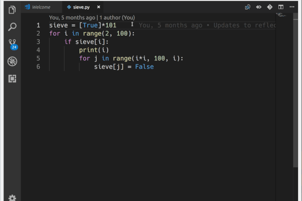 为了让Python插件发挥作用,我们需要将文件存储为后缀为py的文件,如sieve.py。你可以通过菜单栏File—Save File,或者按下Ctrl+S,或在命令盘键入save file来做到这一点。VSCode看到py后缀就会将文件解释为Python代码。现在你的窗口应该长这样:
