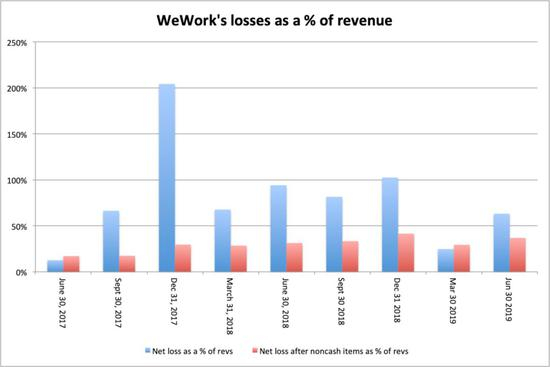 此外,WeWork的损失在其收入中所占的百分比,也没有随时间下降。如下图: