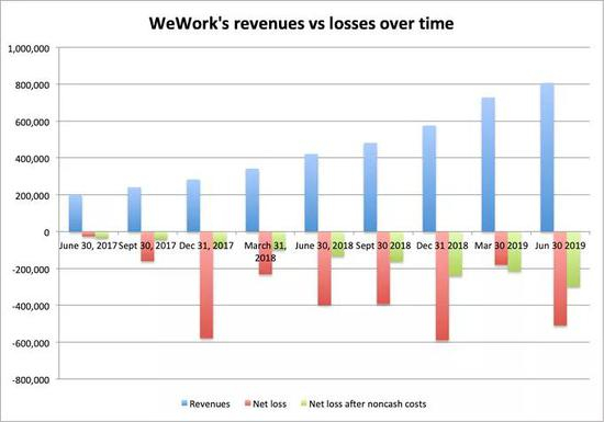 WeWork在其招股说明书称:“尽管我们不认为长期看净亏损占收入的百分比会增加,但我们的净亏损占收入的百分比可能会在短期内增加,并将继续绝对增长。”