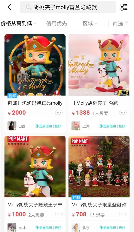 例如,原价59元的潘神圣诞系列隐藏款,在闲鱼上的二手交易价格已突破2500元,涨幅超过40倍;Molly胡桃夹王子隐藏款二手交易价格也达到千元级别,个别商家甚至标出2000元的高价,着实令人瞠目结舌。