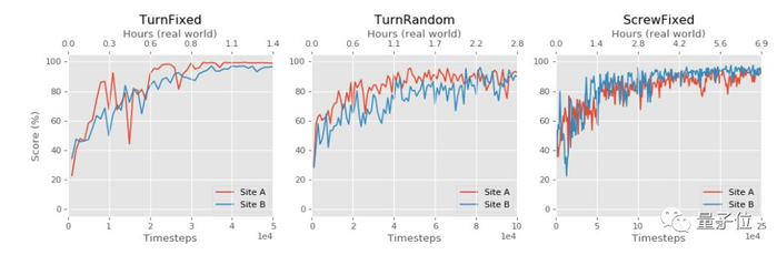 两条训练曲线几乎重合。也就是说,在不同地点建造的两只机器人,不仅表现出了相似的训练进度,并且最终都收敛到了同一性能水准。