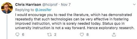 哈里森回复道:我鼓励你阅读文献,这些文献已多次证明,这种技术对于改进教学非常有效,而今天迫切需要这种技术。大学教学的现状不是前进的方向,因此进行探索性研究。