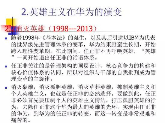 以上这三个阶段从呼唤英雄到消灭英雄,再到呼唤群体英雄,这就是任正非的英雄观,是华为英雄主义的演变。