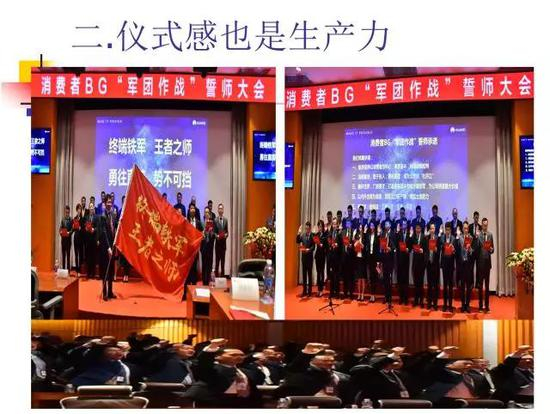 仪式感也是生产力,授旗仪式、战时宣誓、部门参战动员,这些庄重、激昂的仪式把华为人带进了战斗的状态。我们认为仪式感是一种氛围,这个氛围所发挥的作用是远距离的,不是直接接触的作用。当你进入这种状态、这种氛围,你的行为、思想就会发生变化,尽管看不见摸不着。我们现在很多企业都讲企业文化,企业文化确实重要,但我认为还有一个比企业文化更重要的东西——组织氛围。