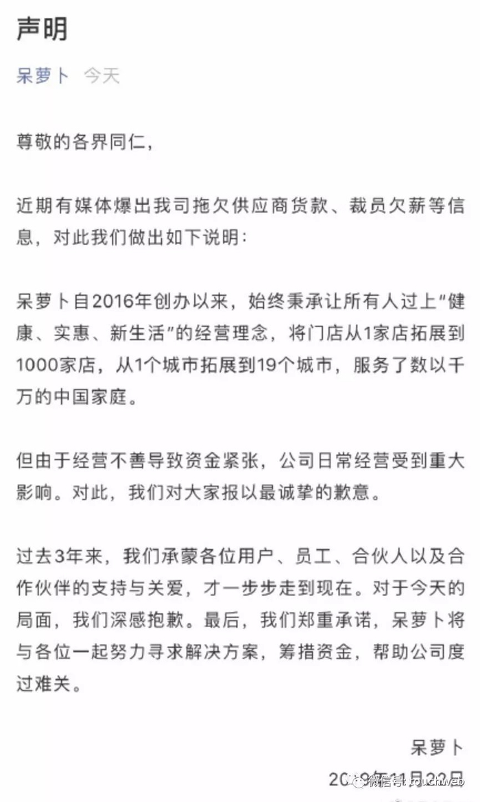 呆萝卜日前被曝出欠款达2.9亿,包括拖欠供应商的款1.5亿,门店充值5000万,合伙人保证金5000万,还有员工工资及补偿金4000万。