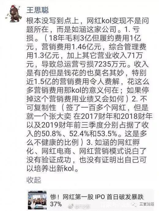 如涵破发后,王思聪曾评论指出如涵的三点问题。一是亏损严重。王思聪指出如涵控股2018年毛利3亿但履约费用1亿元,营销费用1.46亿元,综合管理费用1.3亿元,加上其它营业收入71万元,总运营亏损7235万元。王思聪称不能理解如涵花费高昂费用养KOL意义何在。