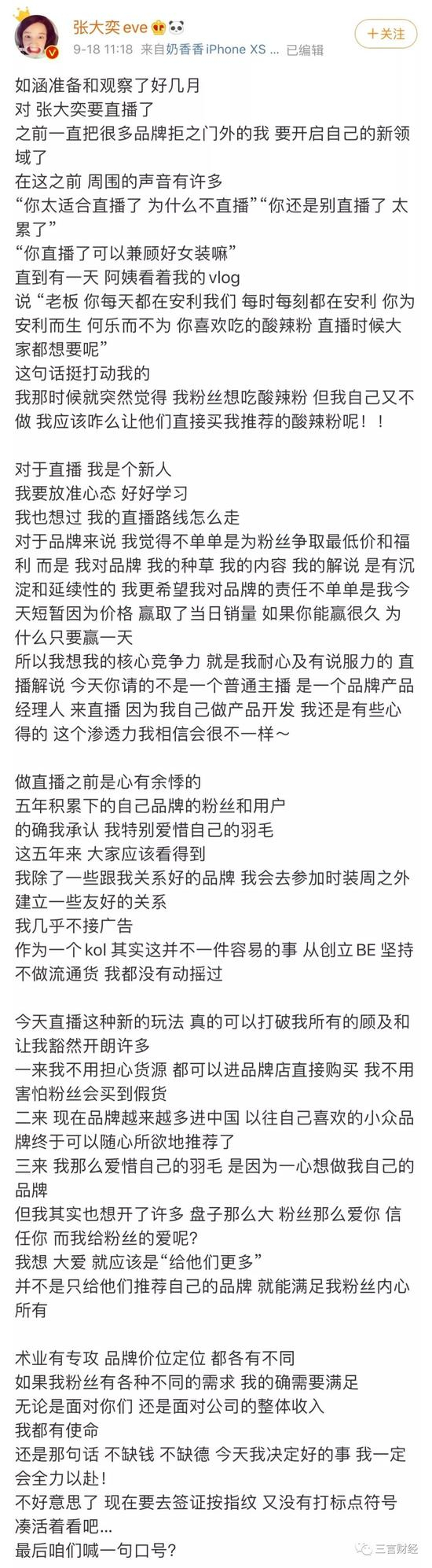 或许是因自己“风头”被李佳琦、薇娅盖过,抑或是亲眼见证李佳琦直播卖货的能力,张大奕终于坐不住,于2019年9月18日发文称正式加入直播卖货大军。“对,张大奕要直播了。之前一直把很多品牌拒之门外的我,要开启自己的新领域了。”