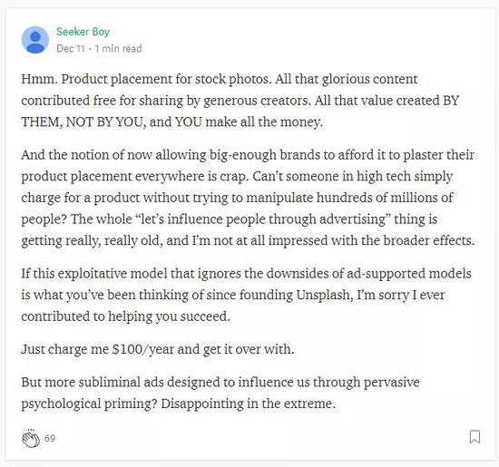 但根据 Unsplash 的使用条款,所有投稿人都已经默认了自己的心血一分钱回报都没有。可能只是现在,这一点被如此明晃晃的体现出来。还是让人难免心里不舒服。