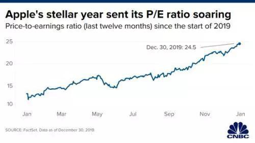 据FactSet数据显示,苹果2019年年初的市盈率略高于13,低于其五年平均值约16,目前已达到24.5。此外,该公司的远期市盈率略低于22点,也达到历史最高水平。
