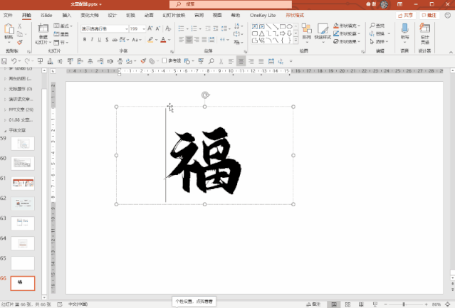 我打开了PPT,输入了一个“福”字,并且对它进行了不同字体的更换。其实支付宝扫福用的是图像识别技术,就是把图片中的文字转换为文本进行识别。所以在PPT中更换不同字体也能够实现扫福操作。
