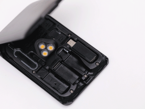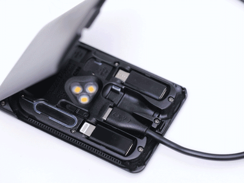 而且不仅如此,它还是一个无线充电器、一个读卡器、一个手机支架、一个电话卡储存槽、一个卡针、一个小夜灯,有多达8种功能。
