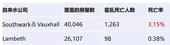 Southwark公司覆盖的居民死亡率为3.15%,Lambeth公司的死亡率为0.38%,二者几乎差了10倍之多,而死亡率高的Southwark公司在泰晤士河的下游,水被污染的可能性的确会更大一些;