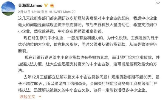 2月13日,在停止更新五个月后,神舟董事长吴海军在微博发声:“这几天政府各部门都来调研这次新冠肺炎疫情对中小企业的影响,我想中小企业最大的问题是面临现金流断裂而倒闭。”他强调,现在能生存的中小企业,一般是有盈利能力的,如若不是被拖欠货款,又很难从银行贷到款,才导致了问题的发生。