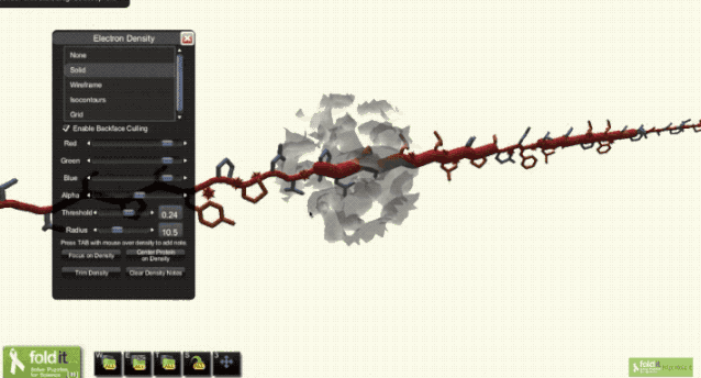 游戏的玩法,是通过鼠标改变蛋白质侧链 (Sidechain)和骨架 (backbone)以及其它一些列复杂结构的位置,来消除病毒。