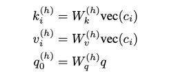 W(h)k 、 W(h)v 和 W(h)q为键(key)、值(value)和查询(query)的嵌入矩阵。输出为三个d维向量。将每项分隔到不同内存中,可以让我们在执行内存查找时了解如何对每项进行加权。