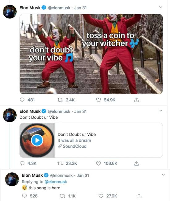 几周前,他把头像改成了录音棚侧影,还连发8条推特来宣传自己的这支单曲 < Don't Doubt Ur Vibe > ,并表示这首歌很难,自己创作了歌词(共8个单词)、演唱了人声。