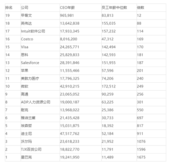 现在,标普500指数里最大的100家公司已经有19家披露了这个“贫富差距”数据,美国媒体Business Insider将它们整理成了一张排行榜。