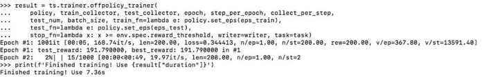 天授提供了训练函数onpolicy_trainer和offpolicy_trainer。当策略达到终止条件时,他们会自动停止训练。由于DQN是无策略算法,我们使用offpolicy_trainer。