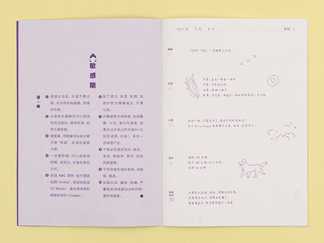 同样附有一本护肤手账,罗列了许多敏感期、维稳期的护肤注意事项以及营养建议,方便你随时查阅。