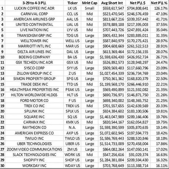 自爆虚增收入的瑞幸,已成为上周美国股市空头最赚钱的股票。据金融分析公司S3 Partner数据显示,上周五,瑞幸咖啡平均空头仓位市值为5.59亿元,净盈利为7.05亿元,空头净盈利率高达126%。