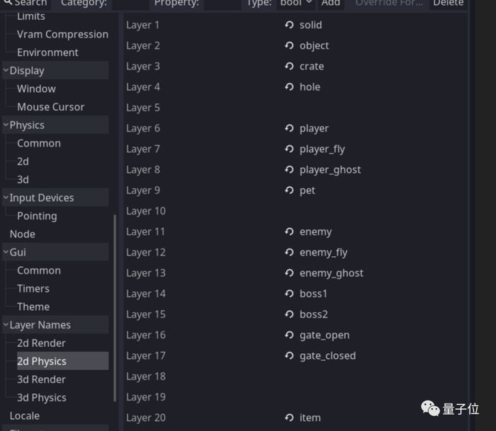 在Godot中选出Project栏,在Project Settings中找到LayerNames选项,根据你的游戏选择2D或3DPhysics。
