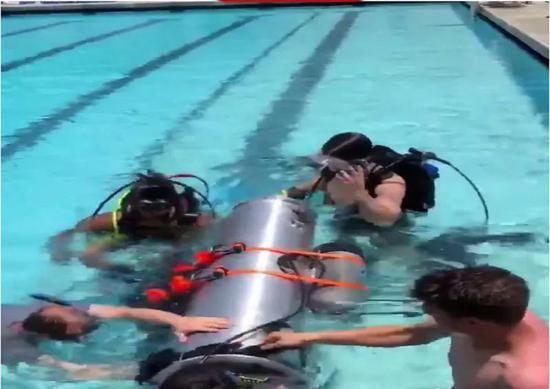 这款潜水艇用的材料是特斯拉SpaceX猎鹰火箭的材料,效率超高的马斯克团队用了8个小时就完成了建造,并花了17个小时就运送到了泰国一所高中的泳池内进行了一系列的试验。