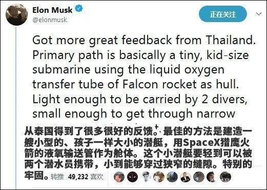 在2018年,几名泰国小孩在野外游泳时,不幸困在了一个情况非常复杂的水下洞穴中,泰国政府各个部门想了无数的招,都没有办法。就在这个时候,马斯克在推特上直接拿出了一个制造微型单人潜艇的救援方案。
