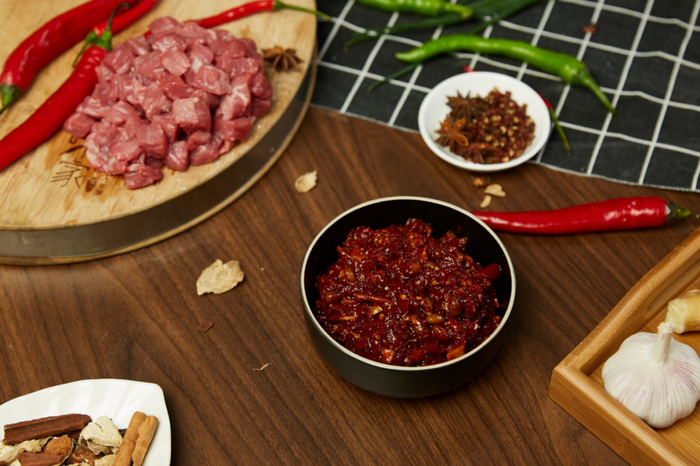 ▶ 大粒牛肉酱:甄选上等黄牛肉,筷子可轻松夹起大肉粒,一口咬上去连筋带肉,Q弹无比,鲜爽滋味足以让口舌生津。