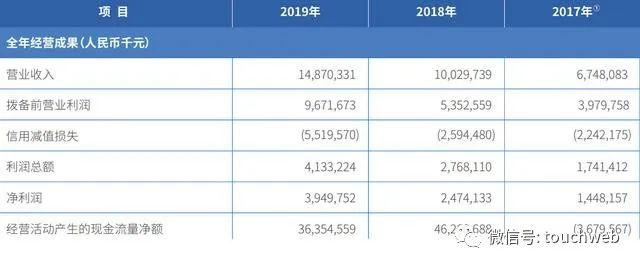 微众银行2017年、2018年、2019年营收分别为67.48亿元、100.29亿元、148.7亿元;净利润分别为14.48亿元、24.74亿元、39.5亿元。