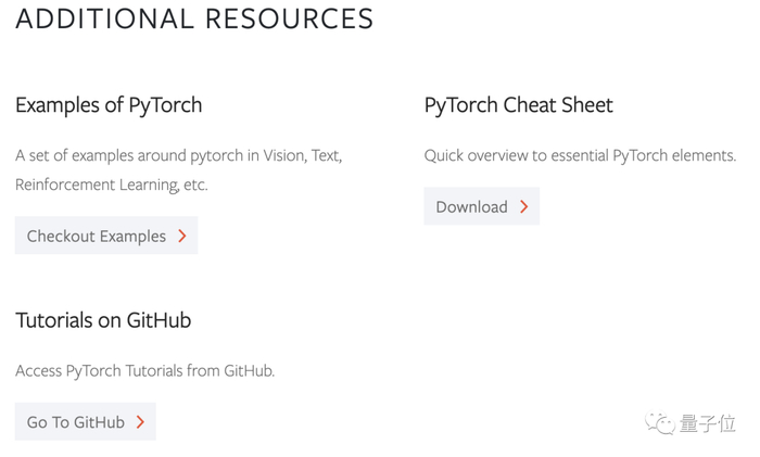 具体的PyTorch示例、PyTorch中常用API、元素的备忘录,以及教程的GitHub链接,则作为附加资源,单独列在教程板块之后,很容易找到。