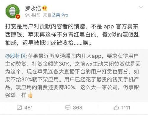 苹果和微信之间的矛盾,并不是最近才开始的。2017年,微信就下架过iOS端的赞赏功能,也是因为苹果的分成机制。按照苹果当时的要求,读者向公众号作者打赏的金额,也要分30%给苹果平台。苹果在这个过程中,没有给公众号作者提供任何帮助和支持,直接拿钱差不多就是不劳而获了。这次风波让苹果遭受一边倒的批评,当时还在做手机的老罗,也进行了极为激烈的抨击。不过,最终的结果,还是以苹果妥协结束,放弃了对微信赞赏的抽成。