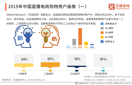 来自iiMedia Research(艾媒咨询)数据显示,选择通过网络直播渠道购物的用户中,男性比例占58%,高于女性42%,其中80后、90后是购物主力军,占比和超过80%。