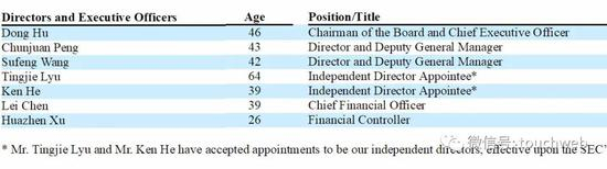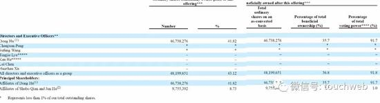 IPO后,胡东持股为35.7%,拥有91.7%的投票权;Affiliates of Shubo Qian and Jun Hu持股为7.4%,拥有1%的投票权。