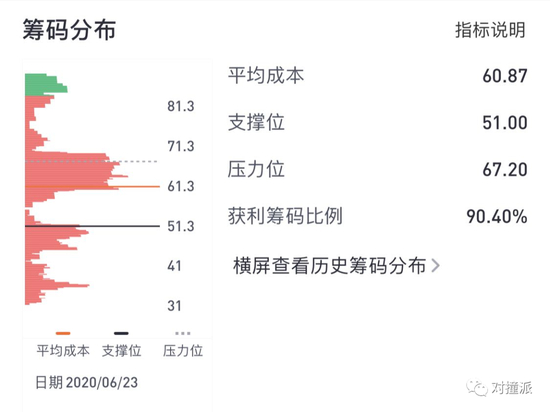 截止到2020年6月23日,拼多多流通股票的持仓成本平均为60.87美元,获利筹码比例为90.40%。(数据来自老虎证券
