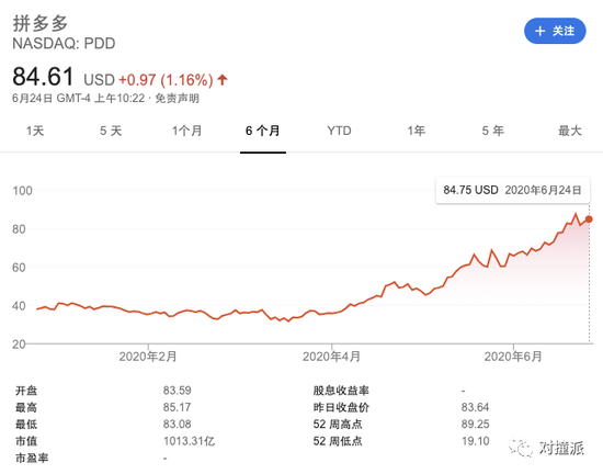 与此对应的是,拼多多市值一路高歌,突破千亿美元大关(1002亿美元),不仅超过了京东(886亿美元),还比京东高了116亿美元。