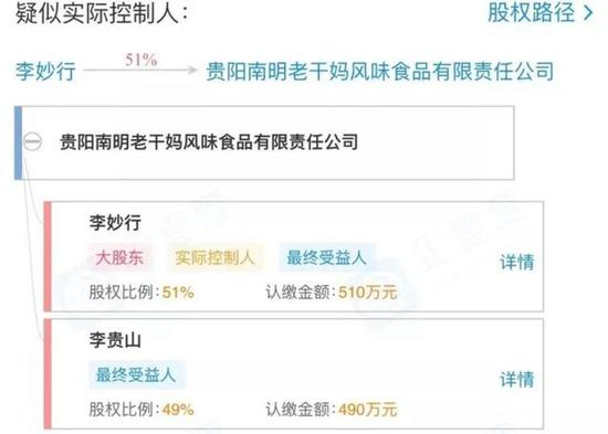 和很多家族企业一样,老干妈股东结构也异常简单:只有陶华碧和两个儿子。2014年之前,大儿子持49%股份,主管市场;小儿子50%,主管生产。陶华碧本人,仅占1%。但2014年6月之后,年近70的陶华碧退出公司股东行列,长子李妙行、次子李贵山分别持有公司51%和49%股权。