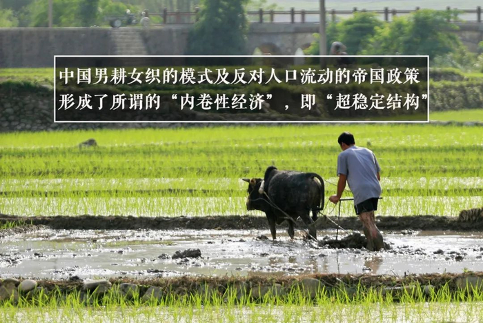 在制度上,中国的男耕女织模式,使得劳动力的投入成本几乎为零,而反对人口流动的帝国政策,则让新的生产力创新缺乏必要性,因此形成了所谓的“内卷性经济”,或用中国学者金观涛的话说,构成了一个“超稳定结构”。