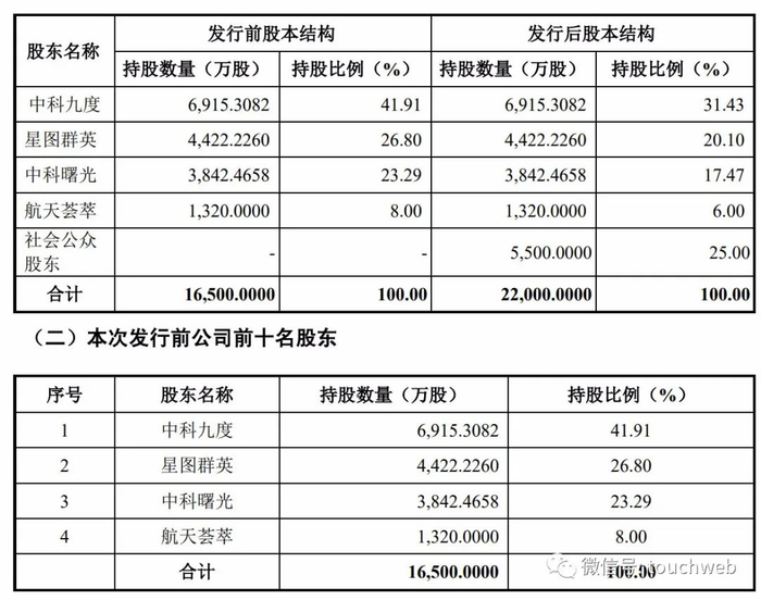 IPO前,中科九度持有公司41.91%的股份,为公司控股股东;星图群英持有公司26.80%的股份,为公司第二大股东。