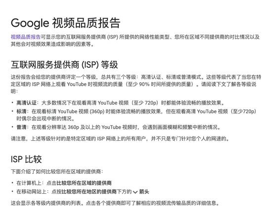 为了进一步“恐吓”运营商,Google从2014年开始对ISP服务进行评级,这个工具其实就是“测测你家网访问YouTube如何”。如果你的测试结果不佳,YouTube会向你详细的科普一下这主要是运营商的锅,并且建议你换个支持Google Peering的宽带。