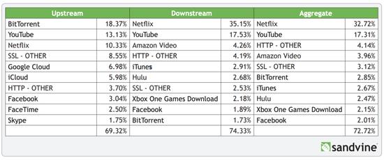 在随后的每一年里,YouTube在公网上的流量占比都远比Netflix低很多,尽管它的播放量和用户数是后者几十倍。2014年,Netflix已占北美上下行总流量的32.39%,而YouTube仅占13.25%。