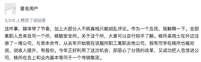 由此可见,「离职」在核所其实是司空见惯的事情。对于离职事件,核所一名党委委员表态:「离职是比较正常的事情,核所的科研环境基本正常,我天天都来上班。」