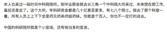 另外,也有业内人士指出,近年来科研圈越来越「官僚化」了,研究所尽管嘴上说着「什么都能耽误,唯独科研不能耽误。」,而现实的科研人际关系网却越来越复杂。